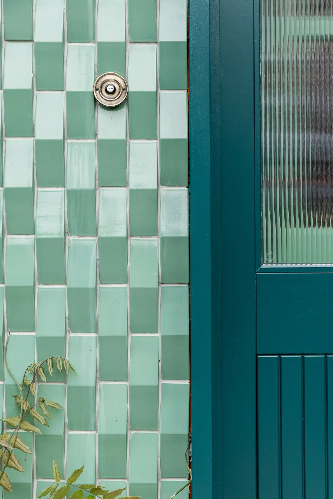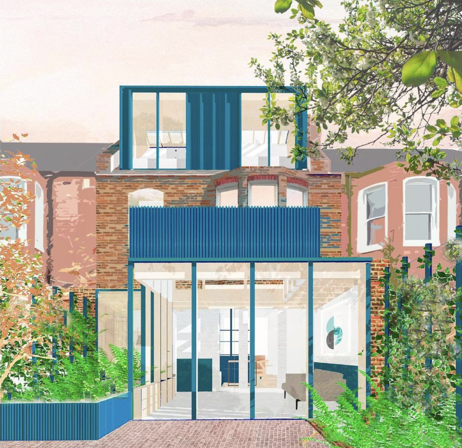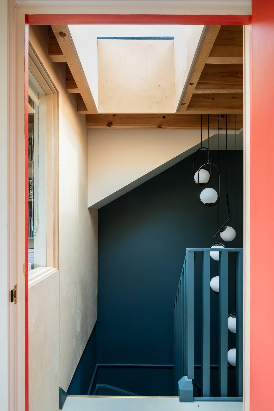 Gimpses of Blue House in Harringay North London. The project involved the low energy retrofit of a Victorian terrace, and the creation of a new library space on the top floor for a writer and a Lawyer (including a secret Lego room). The house involved a young family and a playful approach to new interventions and scale was deployed at each level and the front elevation. A series of varying blues and reds drawn from the existing tiled hallway high different interventions.