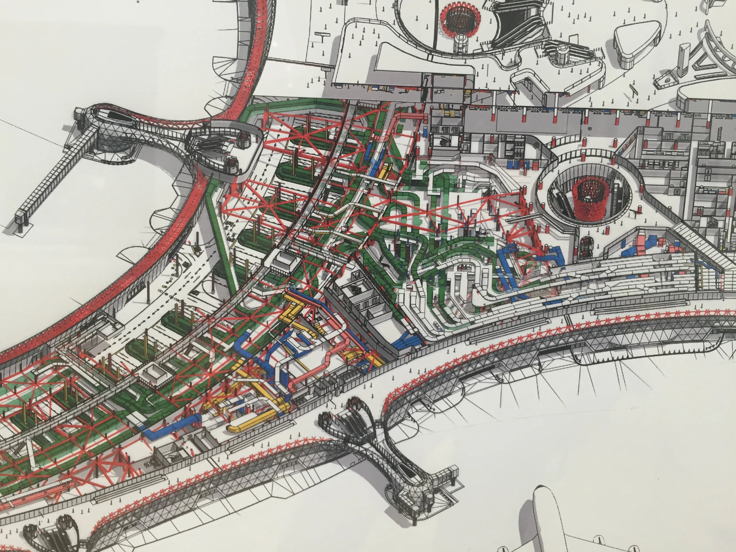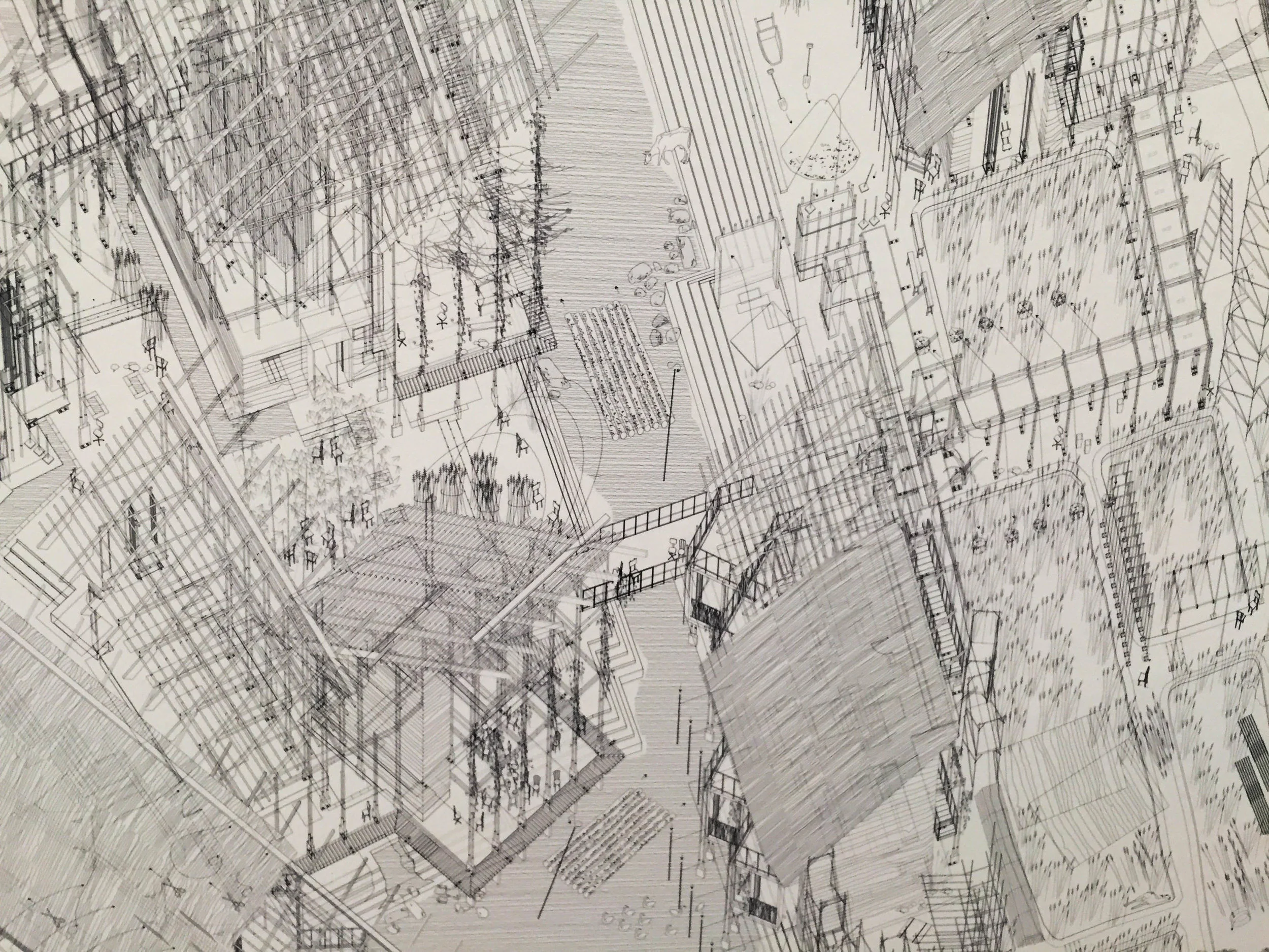 The thematic link this year is construction coordination drawings. Moussavi suggests this takes ‘a slice’ through a process very particular to architectural production, and considered more prosaic than earlier design stages. These ‘slices’ are in the forms of plan section cuts and exploded isometrics and aims to express frozen design team politics, spatial conflicts and layers of negotiation as artform. This is a welcome departure, following the legacy of the curators past publications The Function of Ornament and follows the lineage set over a decade ago by Herzog De Meuron’s Natural History (Tate Modern 2003) and more recently OMA’s progress (Barbican 2012) both inviting a glimpse backstage and inviting independent readings of the by products of architectural process..............