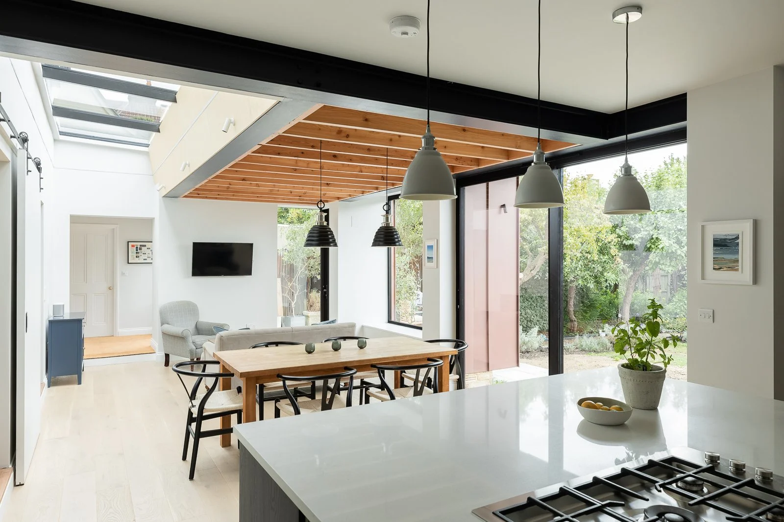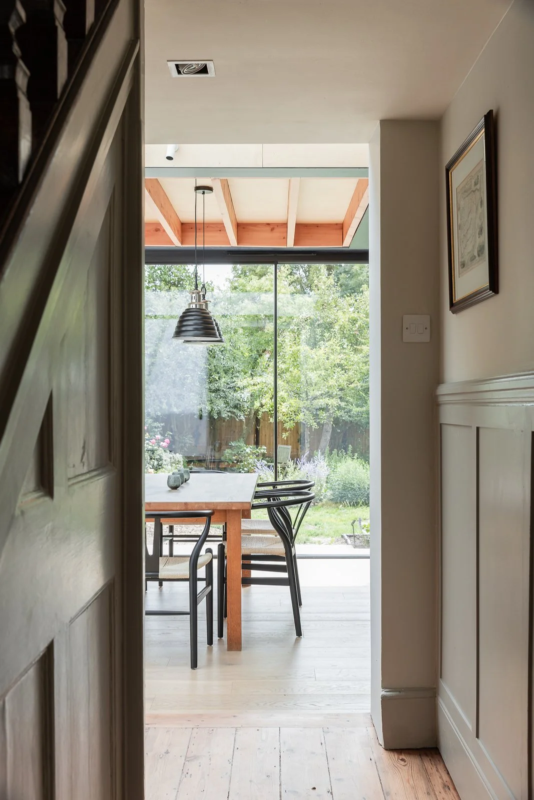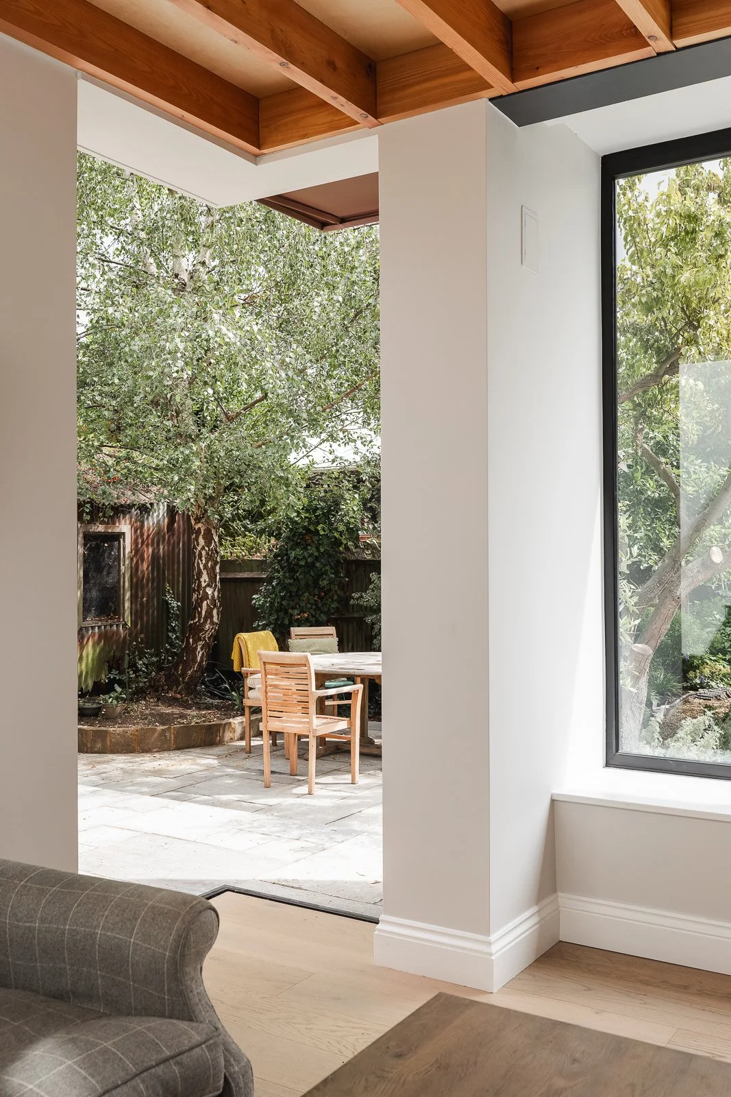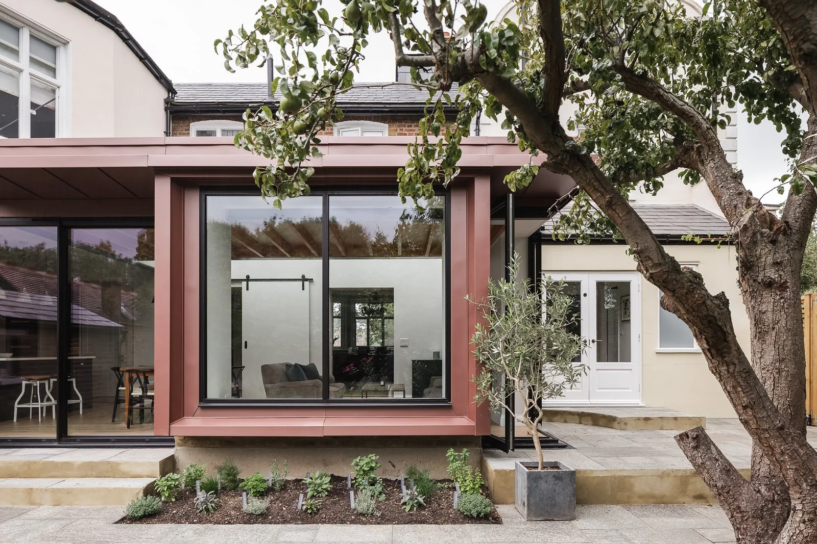 The new extension was designed around a historic pear tree which informs a new corner garden access.